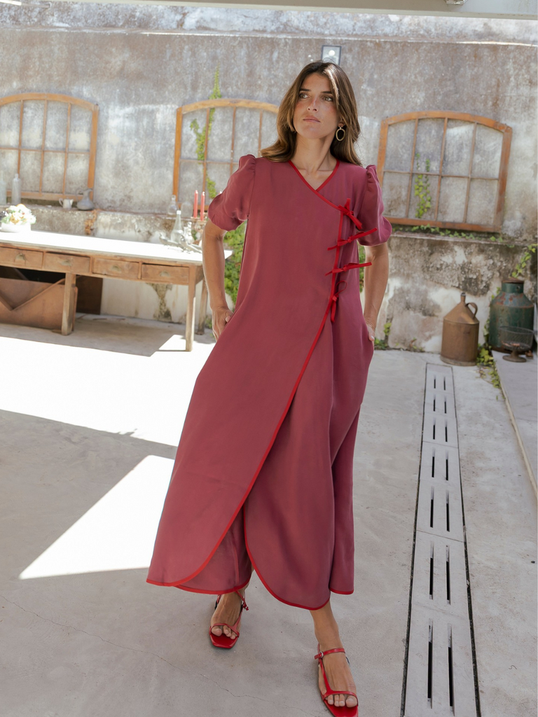 This viscose dress is inspired by and tailored from the iconic Jade Blouse, secured inside with a snap button and tied with four bows. Fully piped edges enhance its finish. The bias cut adds flare and movement, while discreet pockets are hidden in the side seams.