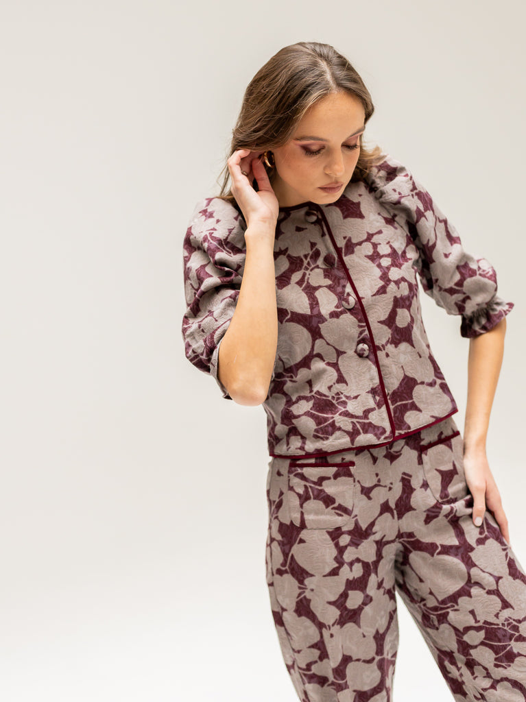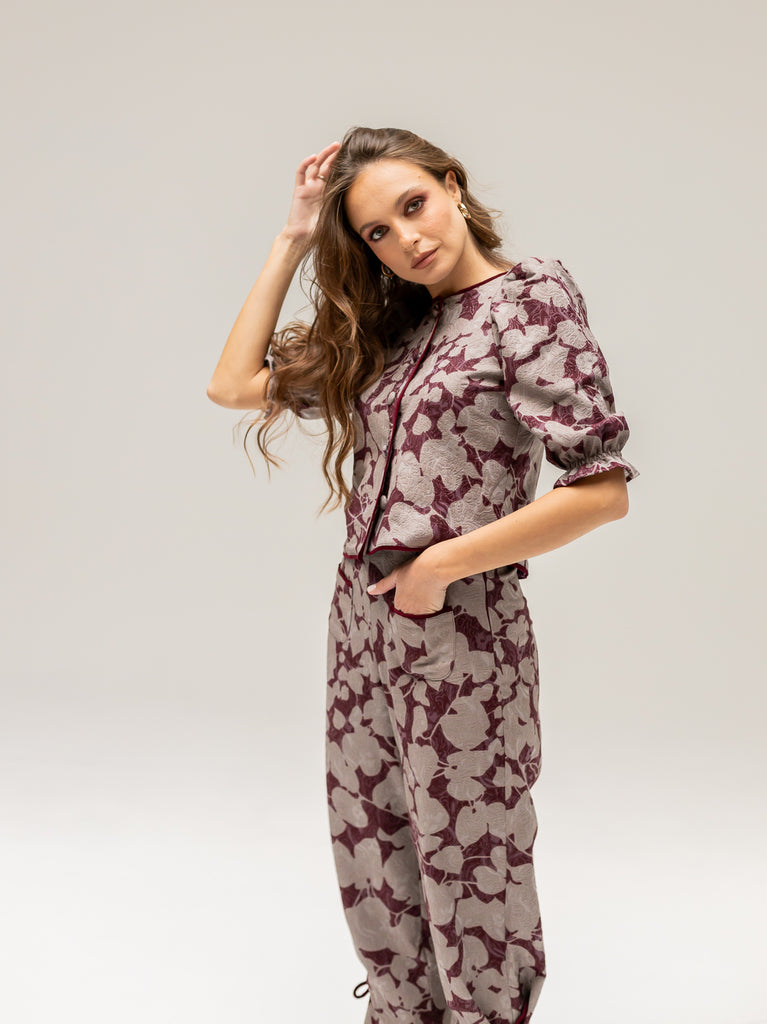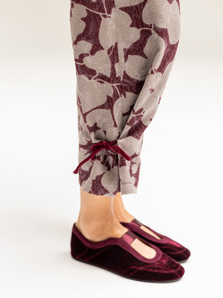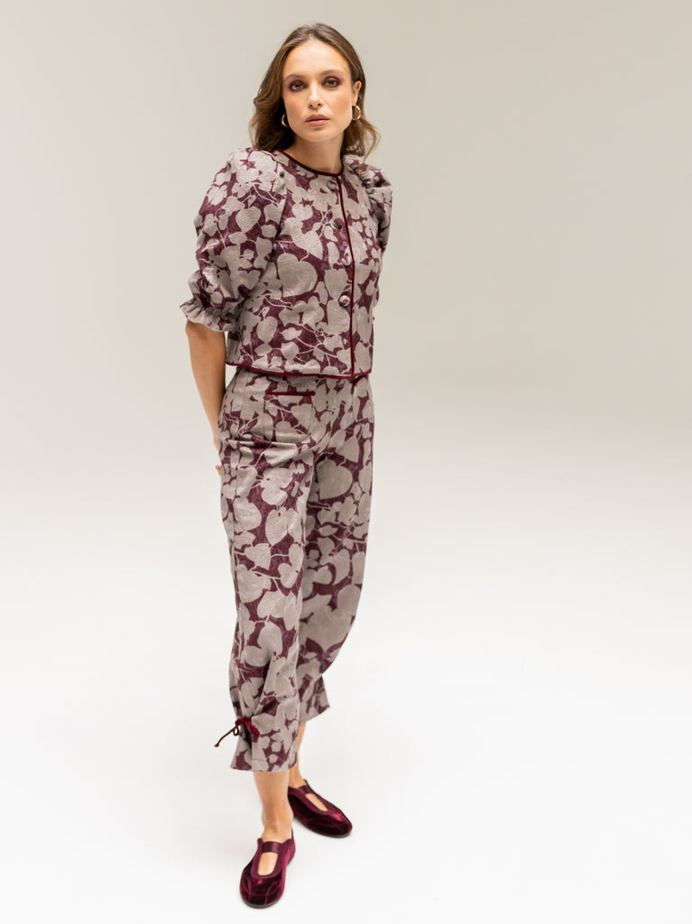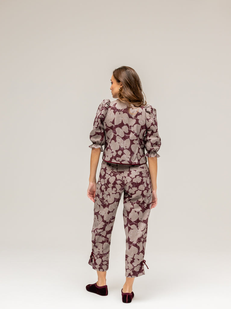 The Calças Nina have a culotte-style fit, with a side zipper and two front pockets. They are made of Jacquard cotton fabric in a floral design featuring shades of gray, eggplant, and wine. The pants also have two drawstrings for adjusting the ankle width, and pair well with the Thérèse Vinho blouse, mini skirt, and Camille Flores blouse. Thanks to the added elastane in the fabric, they can fit one size smaller than usual.