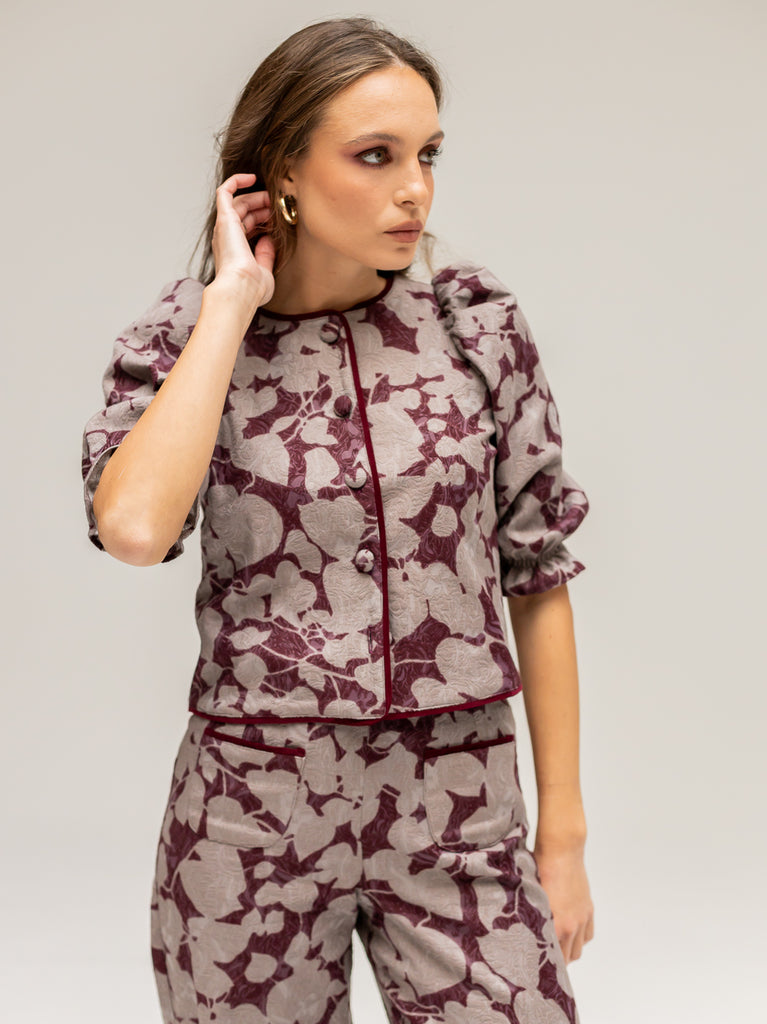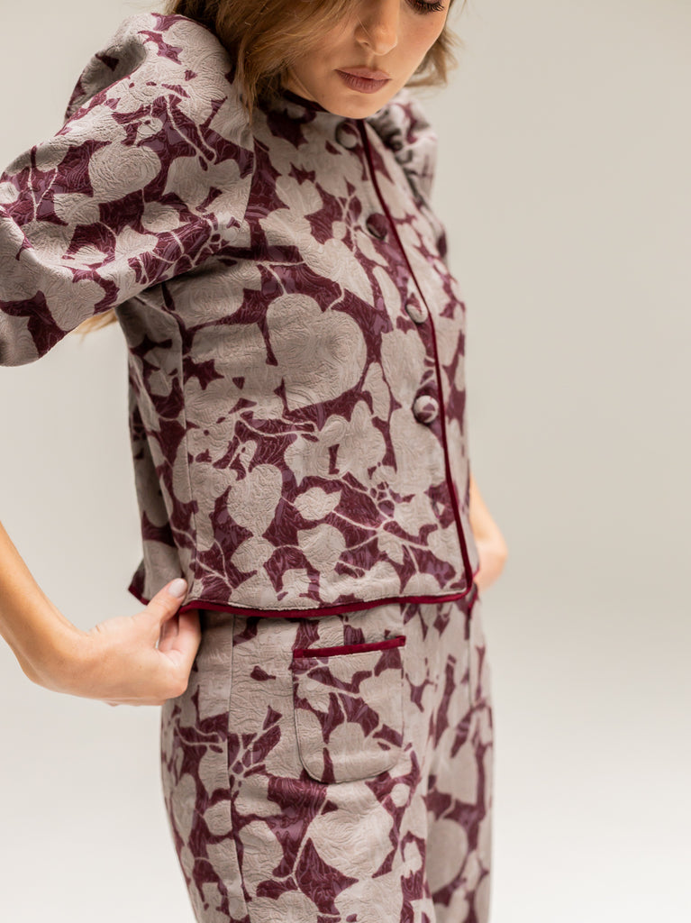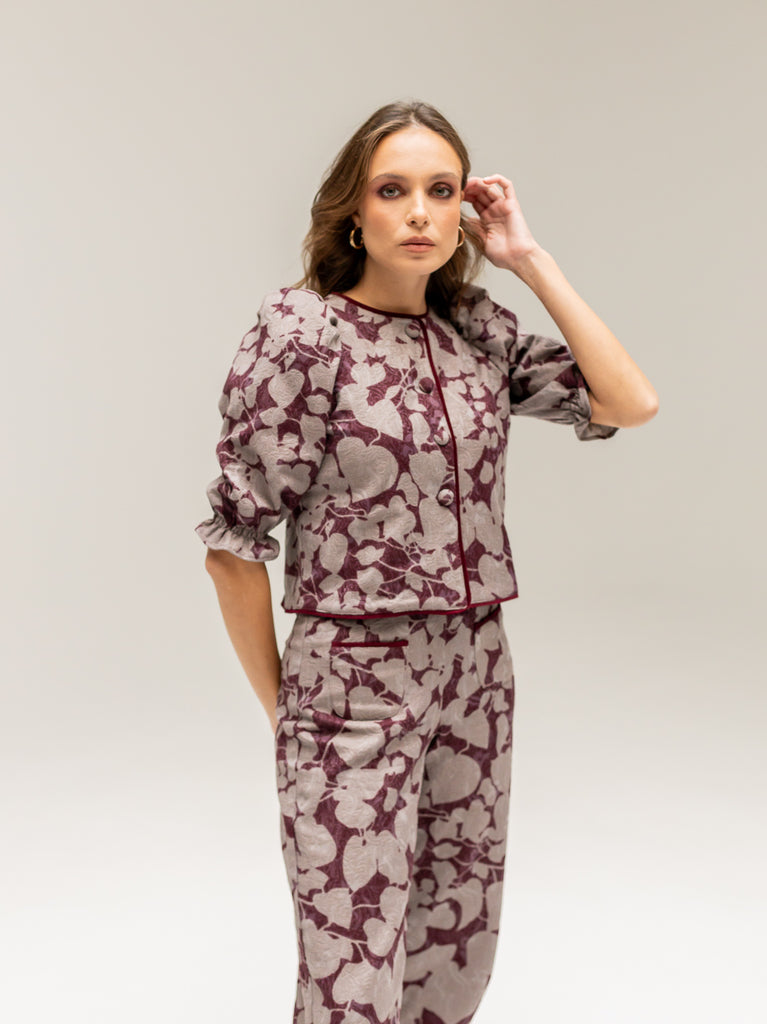 Calças Nina, vestem curto como as calças culotte; Levam um fecho lateral e dois bolsos à frente. O tecido Jacquard em algodão floral em tons de cinza, beringela e vinho; Levam dois atilhos para ajustar a largura no tornozelo; combina com a Blusa Thérèse Vinho, a mini saia e a Blusa Camille Flores ; Como o tecido tem elastano pode vestir um tamanho abaixo do habitual;