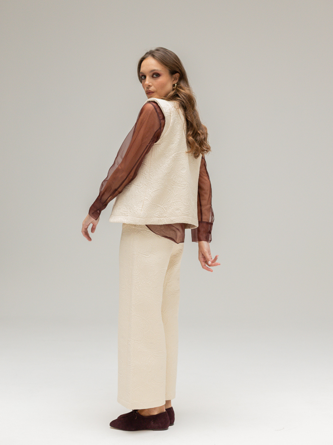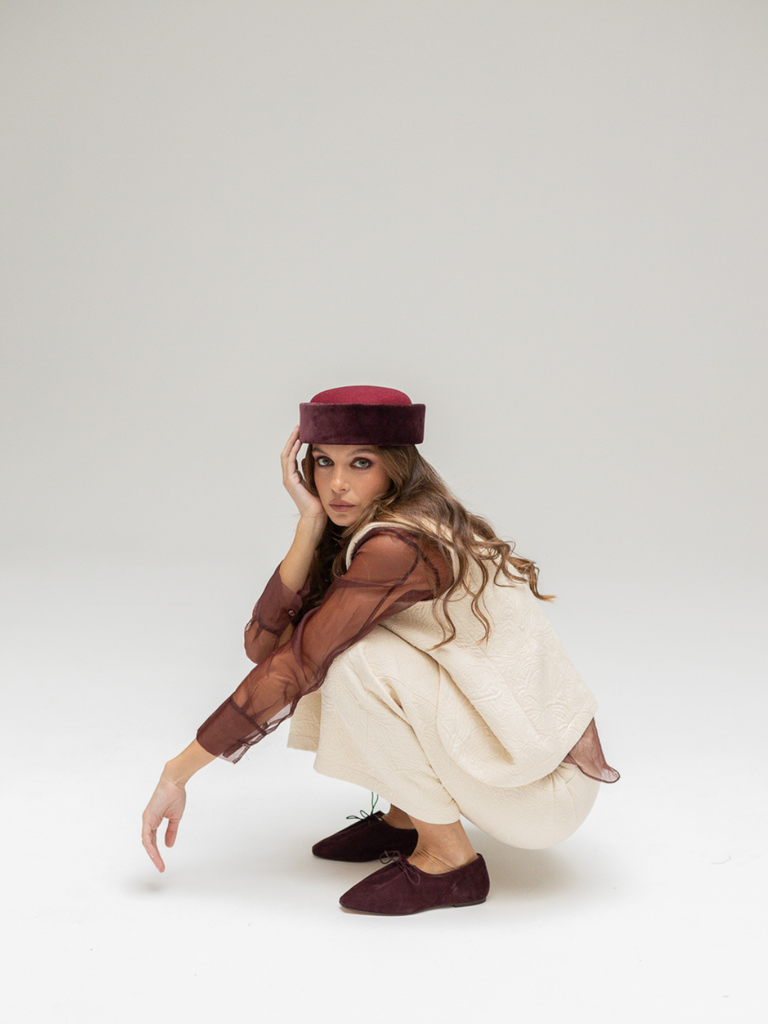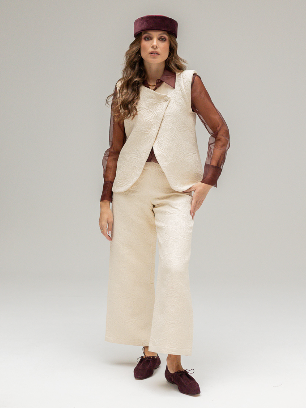 The Nina pants have a cropped fit similar to culottes and feature a side zipper along with two patch pockets. Made from a high-weight floral jacquard knit, the fabric is exceptionally comfortable and pairs perfectly with the Caroline vest crafted from the same material. This version fits slightly smaller—about half a size down—compared to previous models due to the thicker fabric. The model is wearing size S (36).