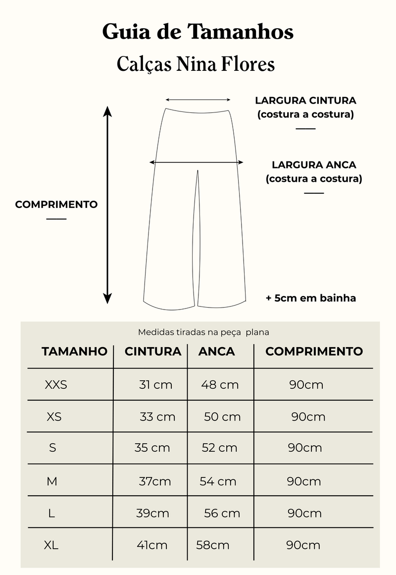 A modelo veste o tamanho S- 36 estando ligeiramente justas, neste tecido que não tem elasticidade aconselhamos o tamanho acima;