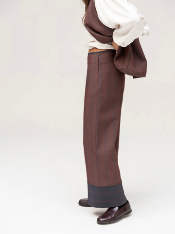 Nina pants, with a shorter fit like culotte pants, feature a side closure. The high-density double-faced fabric, made of silk and polyamide, is incredibly comfortable and matches the reversible Zoé vest and Marie blazer in the same fabric. The fabric has a slight blue stripe pattern (thicker stripes) and very subtle beige stripes; the blue side is accented with a dark wine color. The waistband and ankle cuffs are highlighted, with a slightly narrower design compared to the image.