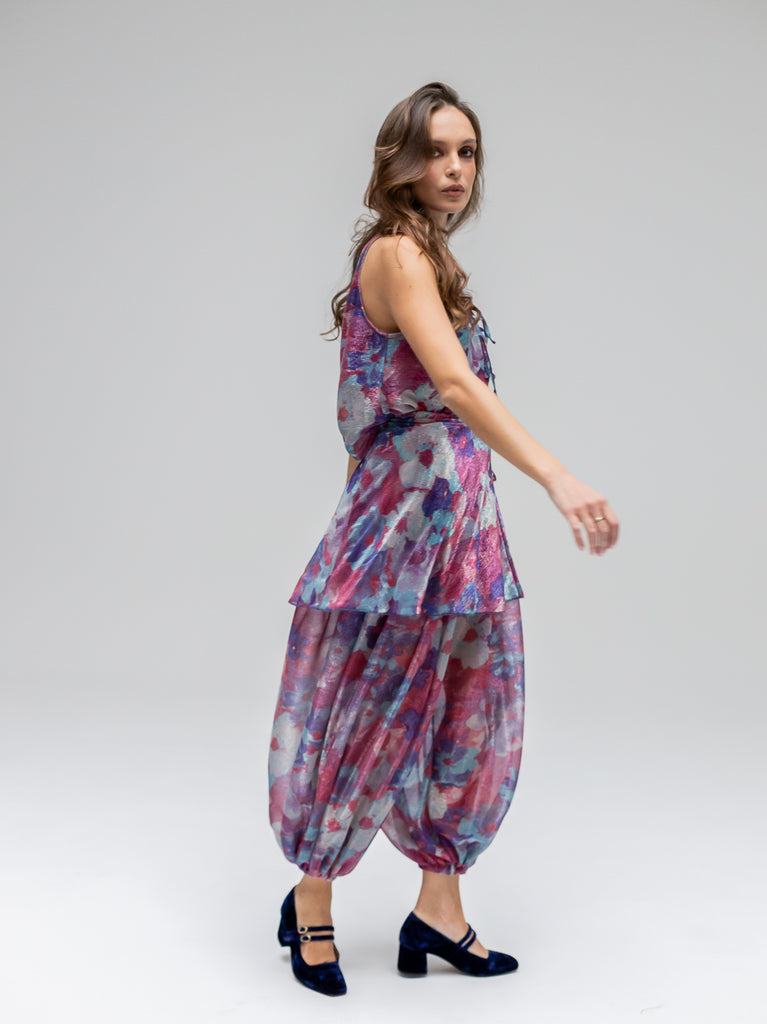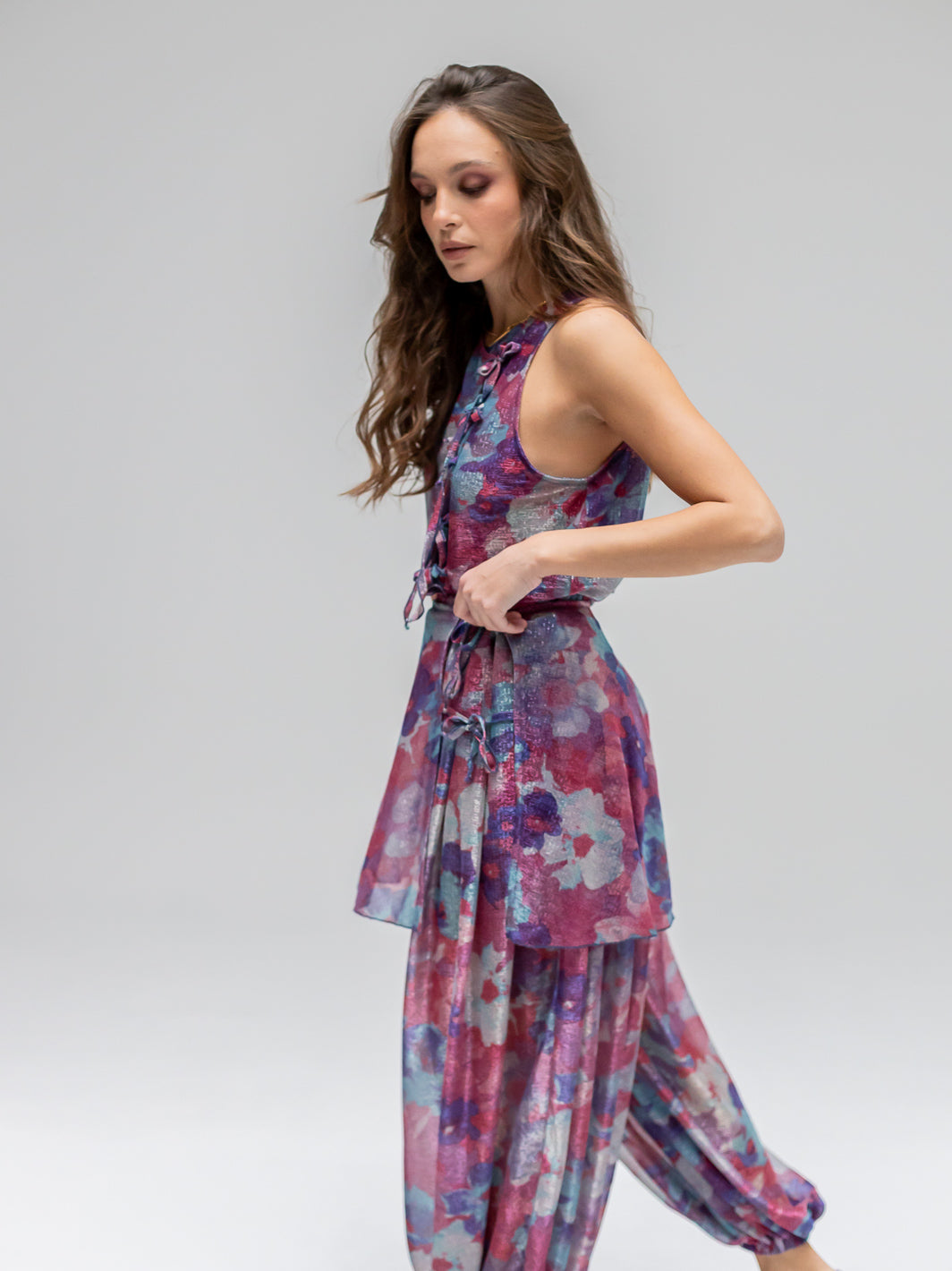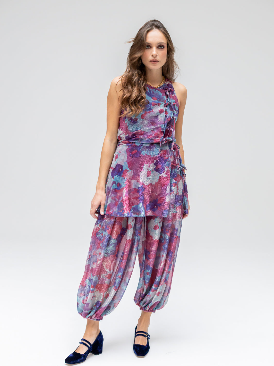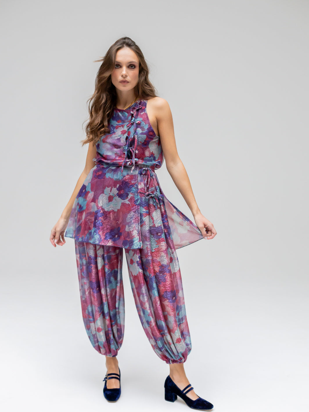 The Mini Saia | Flores functions as a versatile and elegant accessory that perfectly complements any outfit. Its two adjustable side wires ensure a precise fit to your body, while the smooth and sophisticated design adds a touch of class to any look. Pair it with our Boho Flores pants for a special party ensemble.