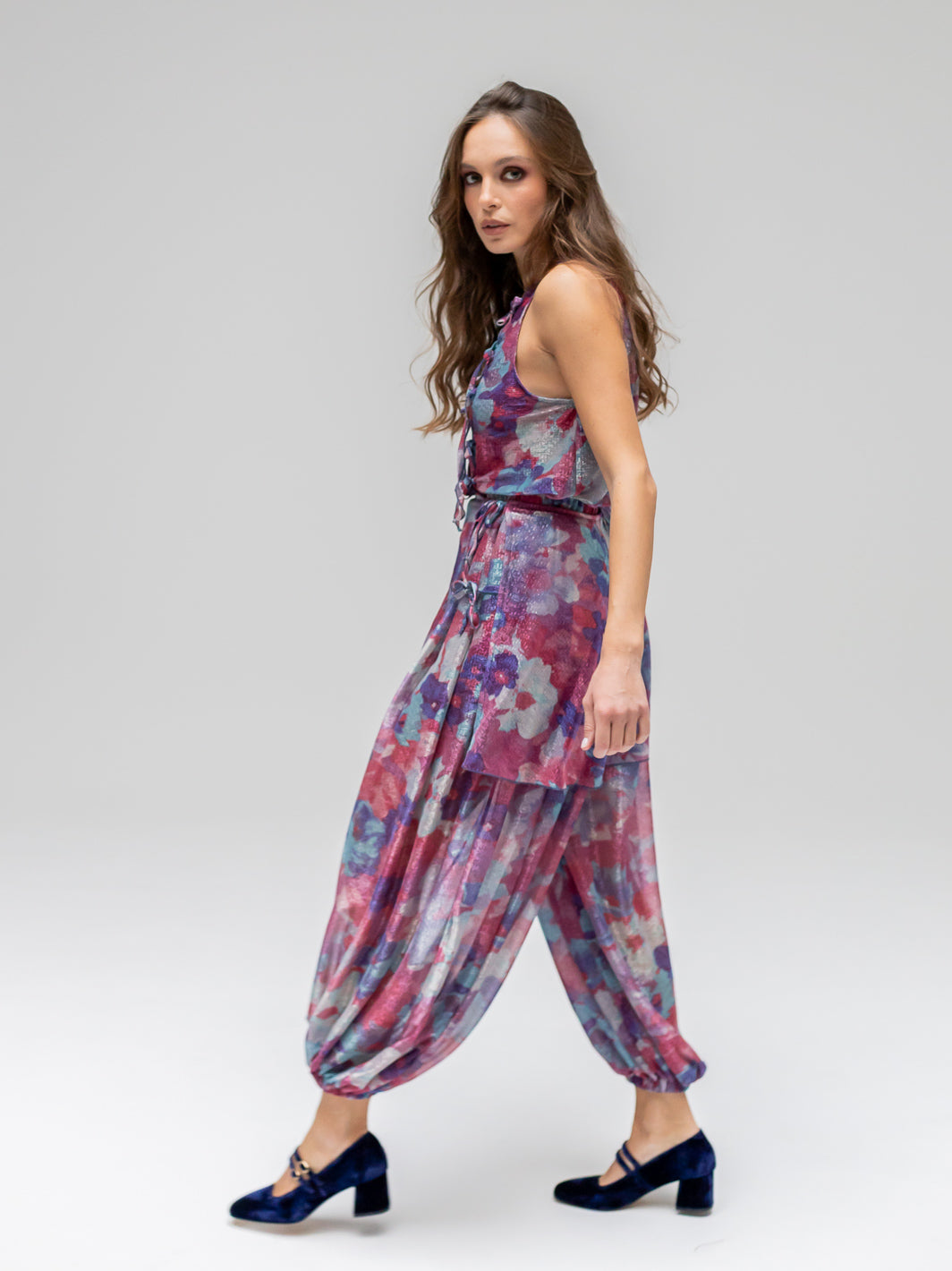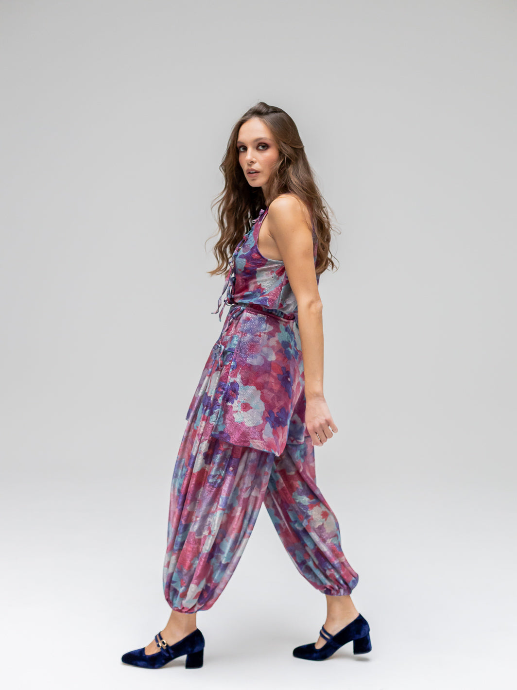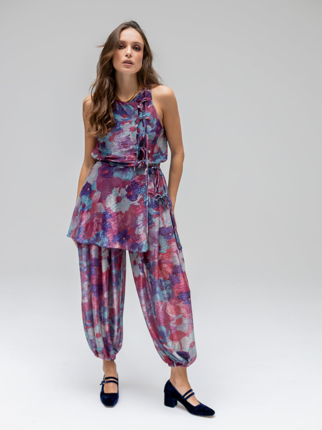 The Mini Saia | Flores functions as a versatile and elegant accessory that perfectly complements any outfit. Its two adjustable side wires ensure a precise fit to your body, while the smooth and sophisticated design adds a touch of class to any look. Pair it with our Boho Flores pants for a special party ensemble.